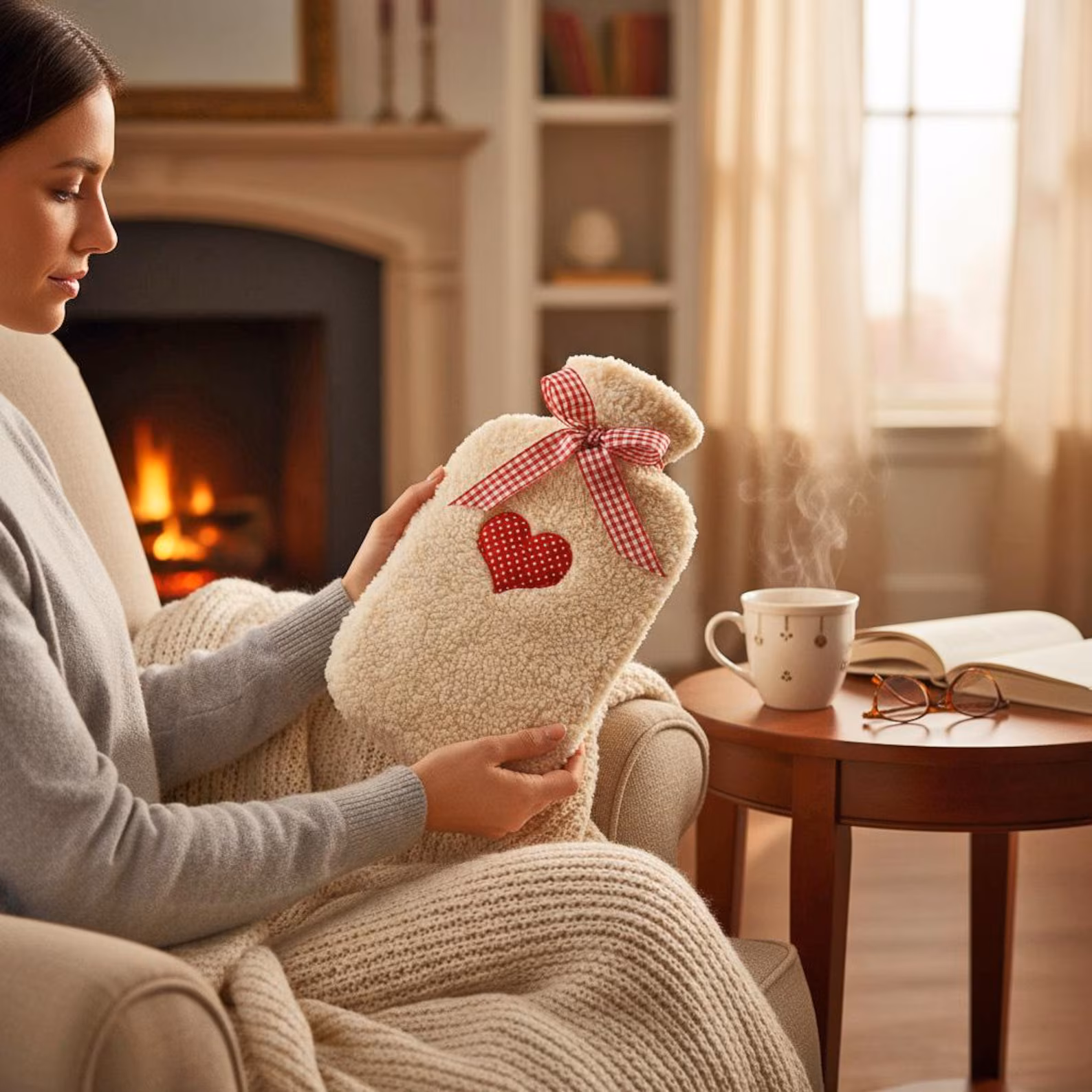 Kuschelige Wärmflasche mit Bezug aus Lammlocke.
